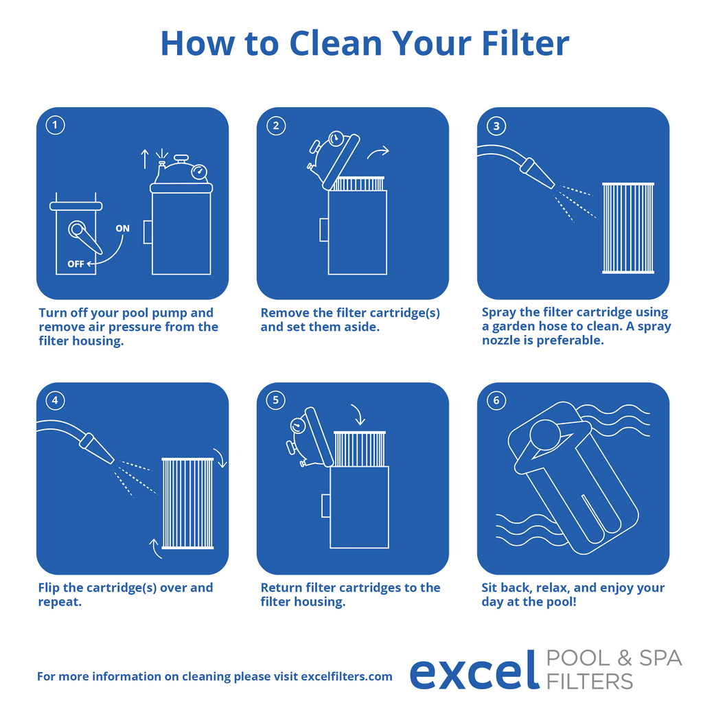 Excel Filters are easy to clean. We recommend filter rotation – while cleaning your filter cartridges, swap them with clean, dry spares. This keeps the water filtration cycle going and no wait to use your pool or spa with the added benefit of your filter cartridges lasting longer.